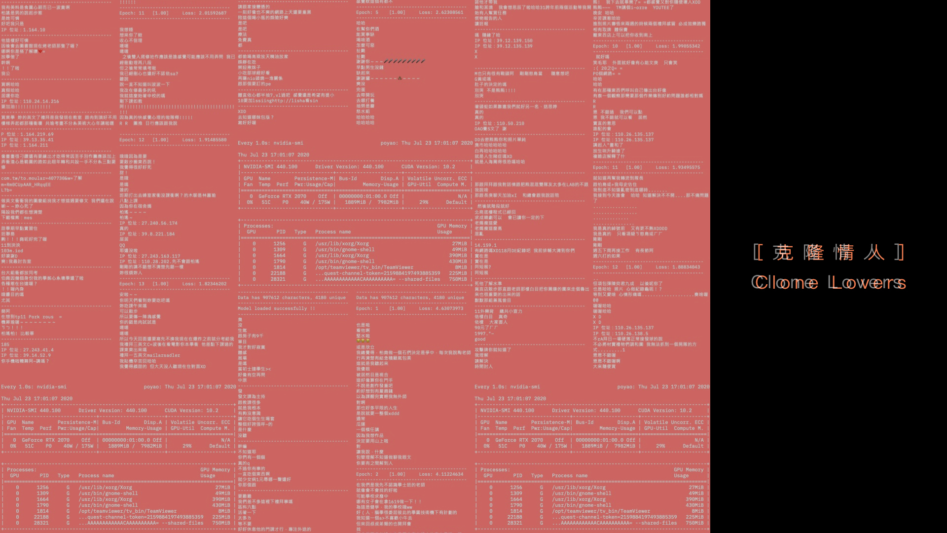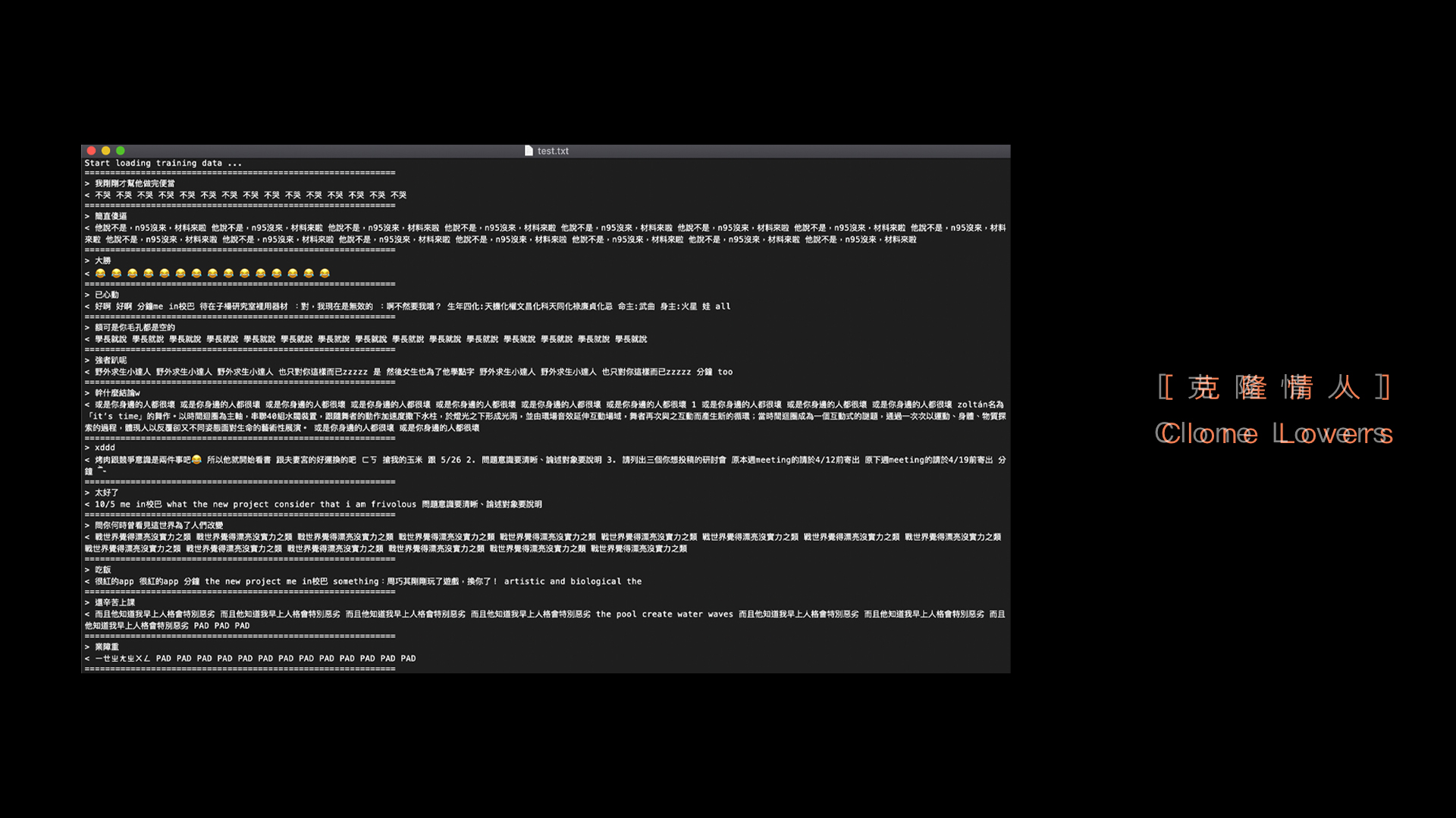 Beginning from personal relational experience, the project “clones” four partners by extracting tens of thousands of chat messages and training an RNN text generator for each. These AI-driven personas do not replicate the real individuals but reassemble them through limited data and algorithmic patterns. By interacting with these text-based clones, viewers encounter the seductive cycle of revisiting, collecting, and re-consuming archived affection—an addictive loop in which intimacy becomes data, and data becomes emotional residue.