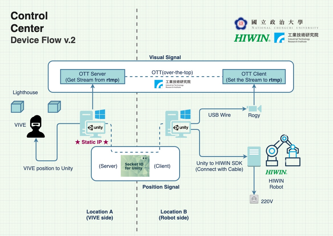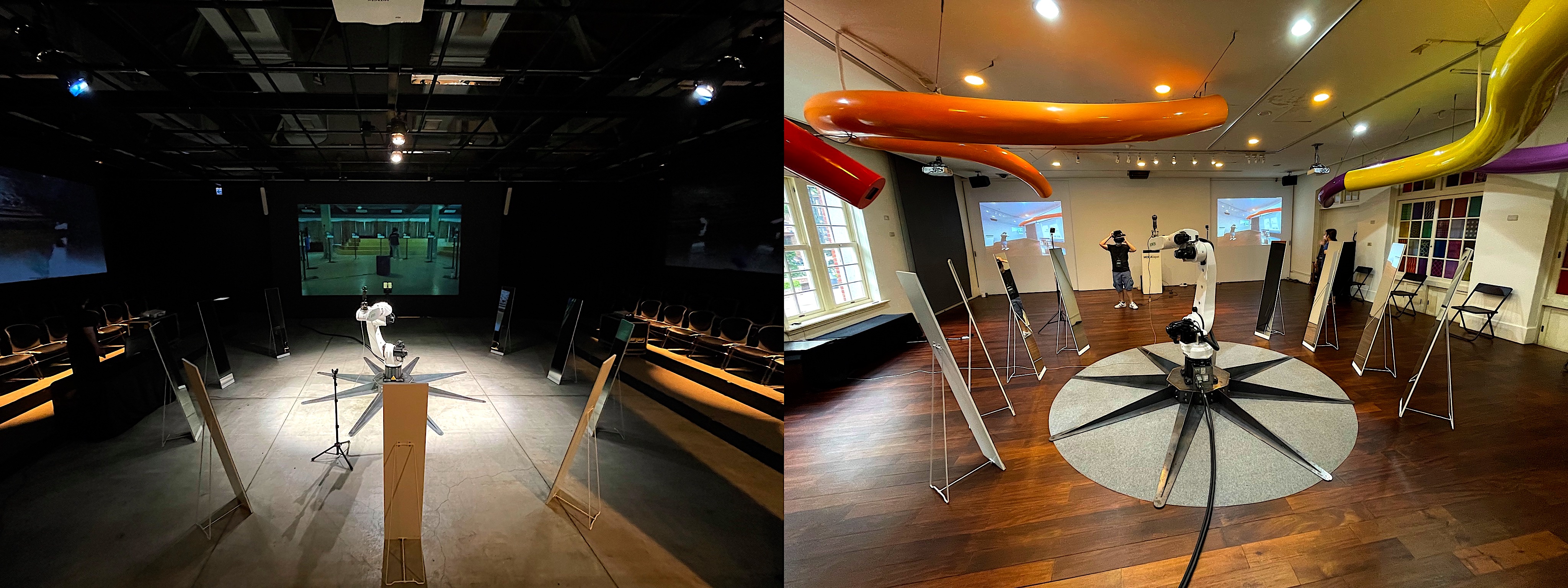 Haptic-enabled robotic devices act as remote prosthetics: virtual hands seen in VR correspond to robotic mechanisms in Space B, allowing the viewer to touch, interact, and physically experience the distant room. The result is a telepresence system where the viewer becomes a remote body—an “avatar” extended across space—while simultaneously occupying a site under constant observation. Through VR embodiment and robotic feedback, Control Center stages a critical encounter between surveillance, agency, and the blurring boundaries of physical identity.