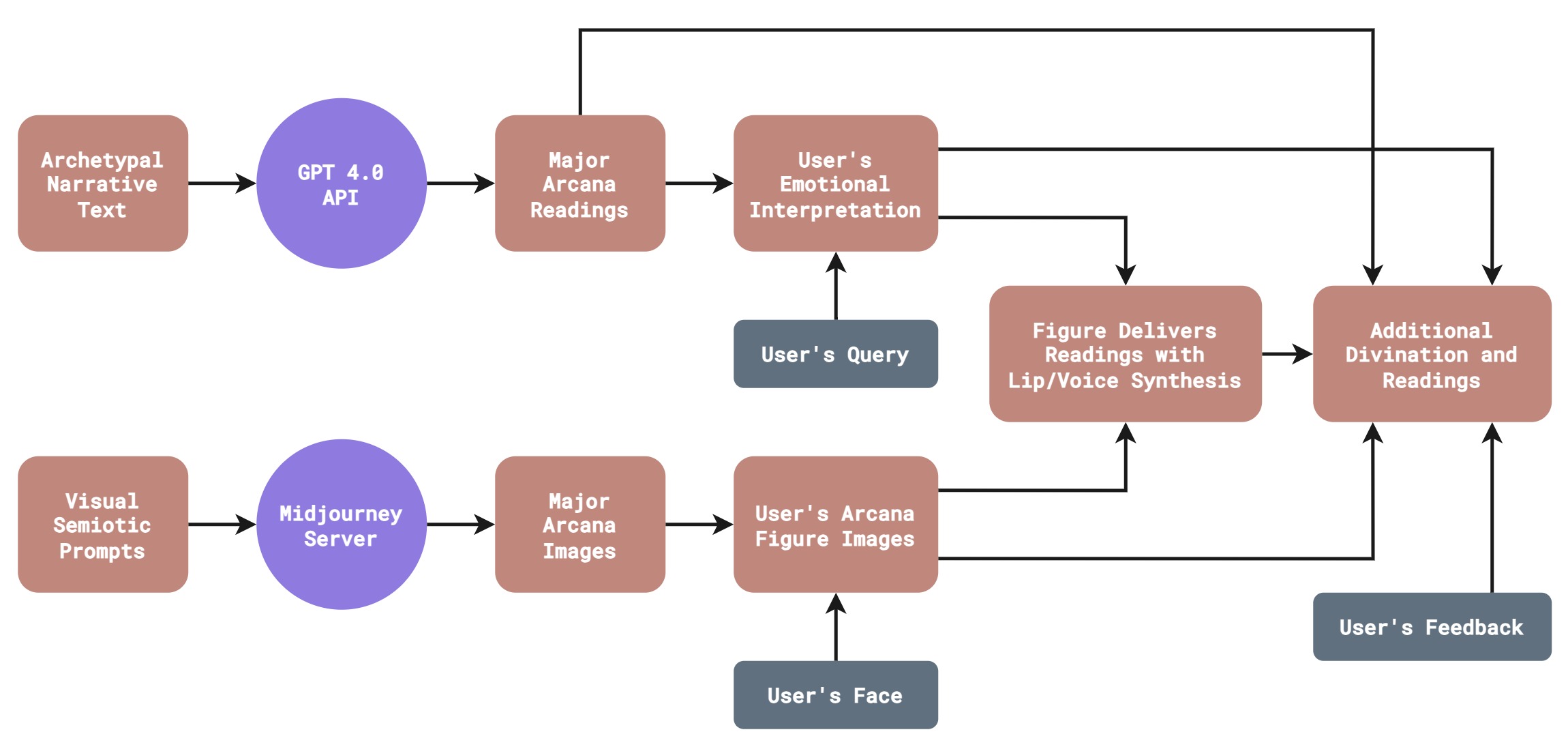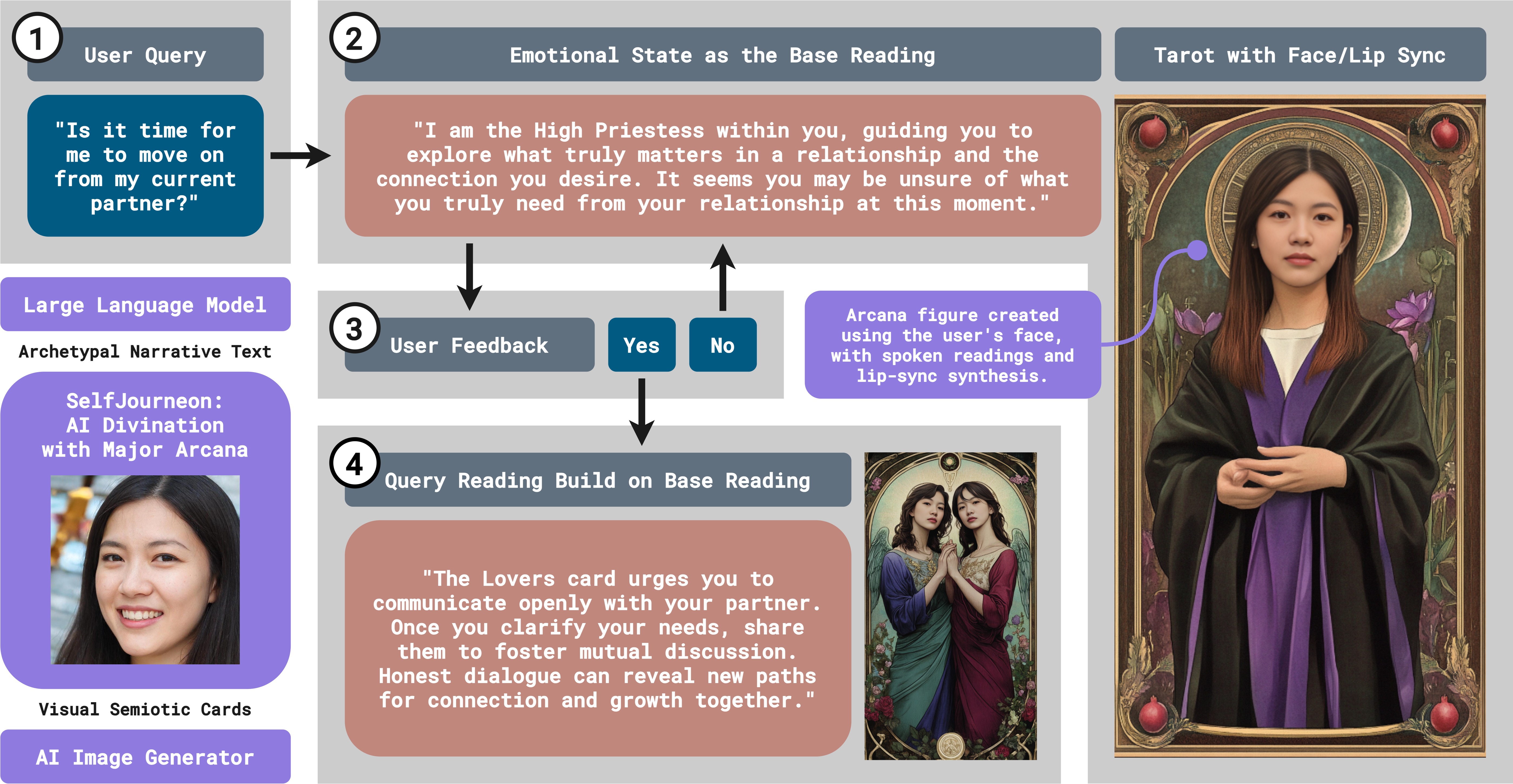 SelfJourneon operates through a three-stage interaction. The system begins by drawing a Major Arcana card based on a user’s question and portrait, establishing the archetypal frame. The user’s face is then embedded into the selected Tarot figure via facial reenactment, generating a personalized symbolic avatar. This avatar speaks through voice synthesis and metaphor-driven prompts, guiding users toward emotional clarity and reflective interpretation. Instead of offering predictions, the system uses a non-directive, empathic design—combining symbolic cues, tonal feedback, and open-ended questioning—to cultivate introspection and narrative co-creation.