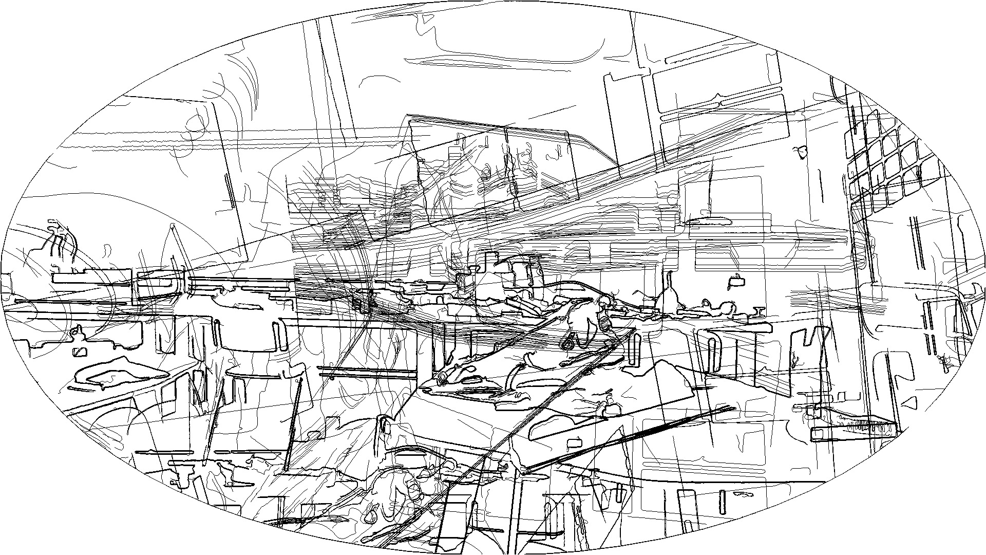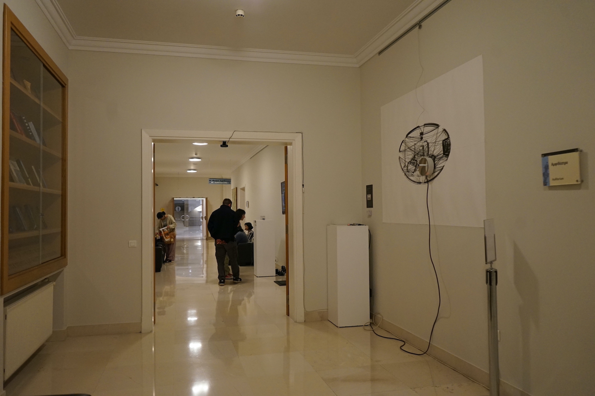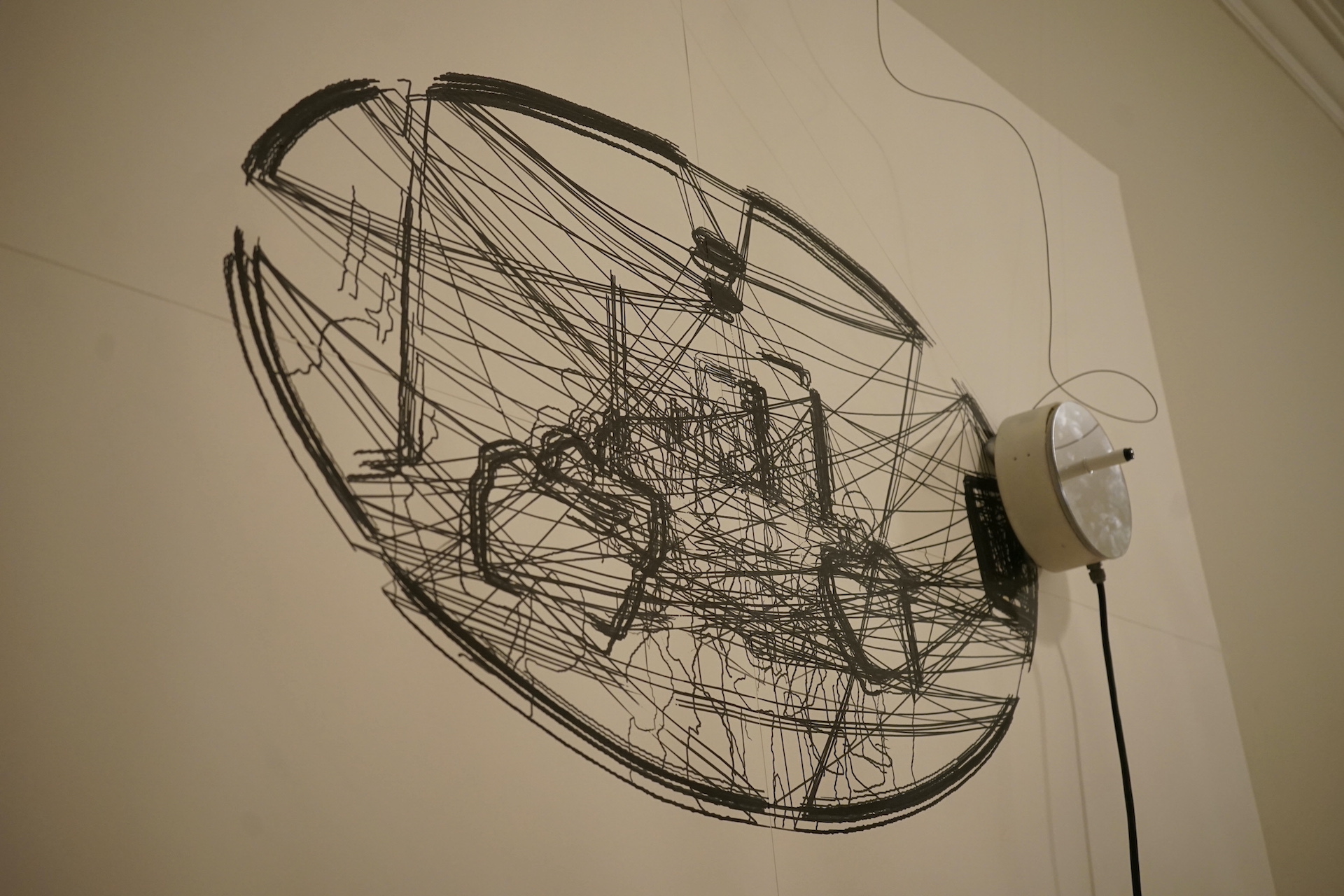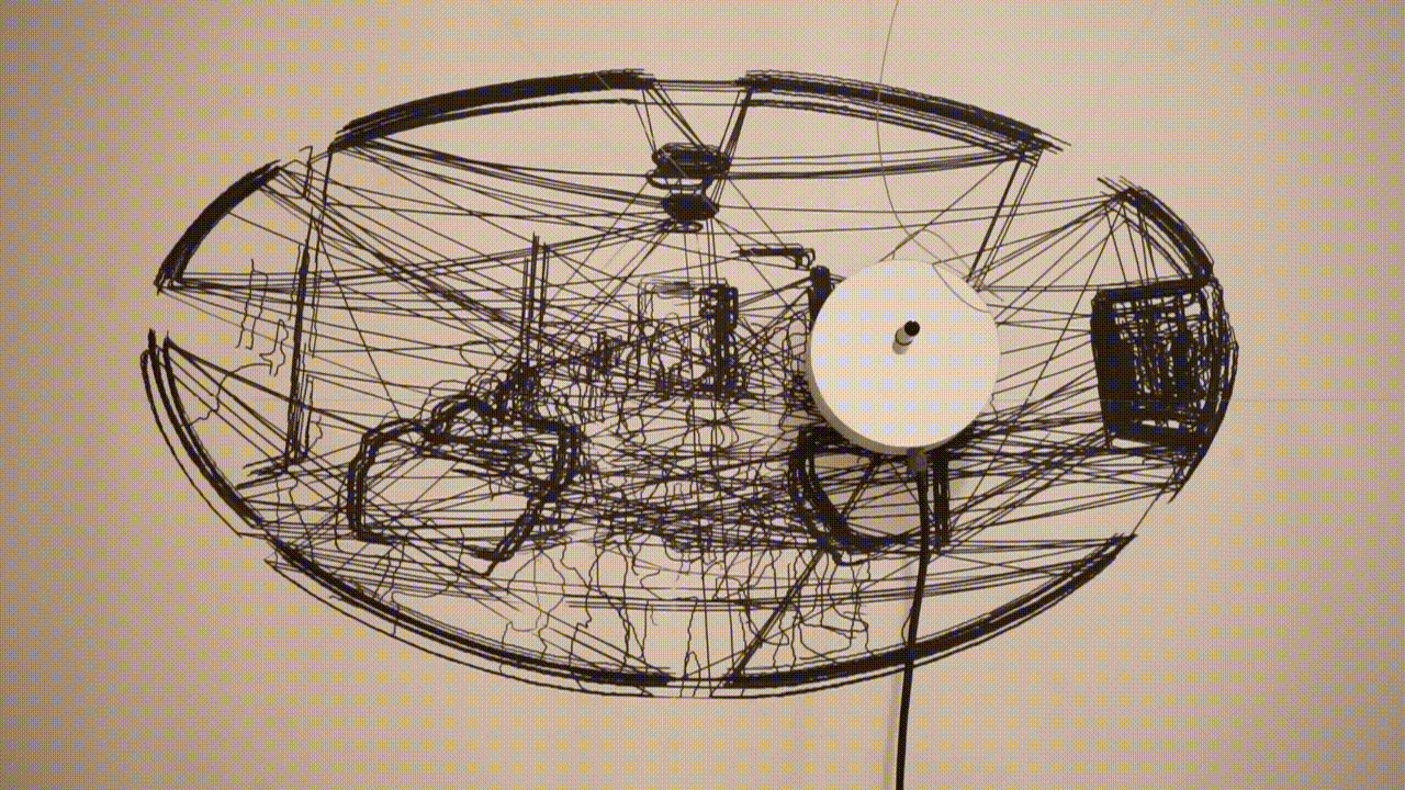 A camera continuously captures long-exposure images of the installation’s front area, extracting frame information in real time. A motor-driven V-plotter mounted on a large wall redraws each frame as line-based imagery, layering new traces atop previous ones. This cumulative process allows the wall to function as a temporal canvas, storing spatial information and motion over extended periods.